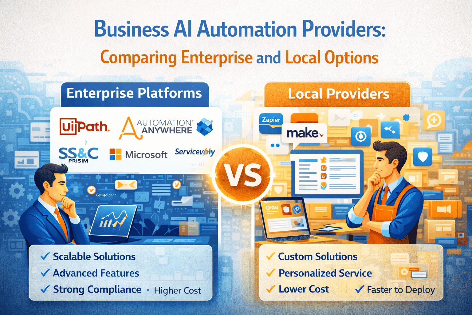 Business AI automation providers must be evaluated based on operational scale, integration complexity, pricing structure, governance requirements, and workforce readiness. Enterprise providers deliver advanced orchestration and compliance capabilities suited for multi-department environments, while local business providers prioritize affordability and simplicity for lean teams. Selecting the right provider requires aligning automation complexity with business size and long-term growth strategy to ensure sustainable efficiency and measurable ROI.