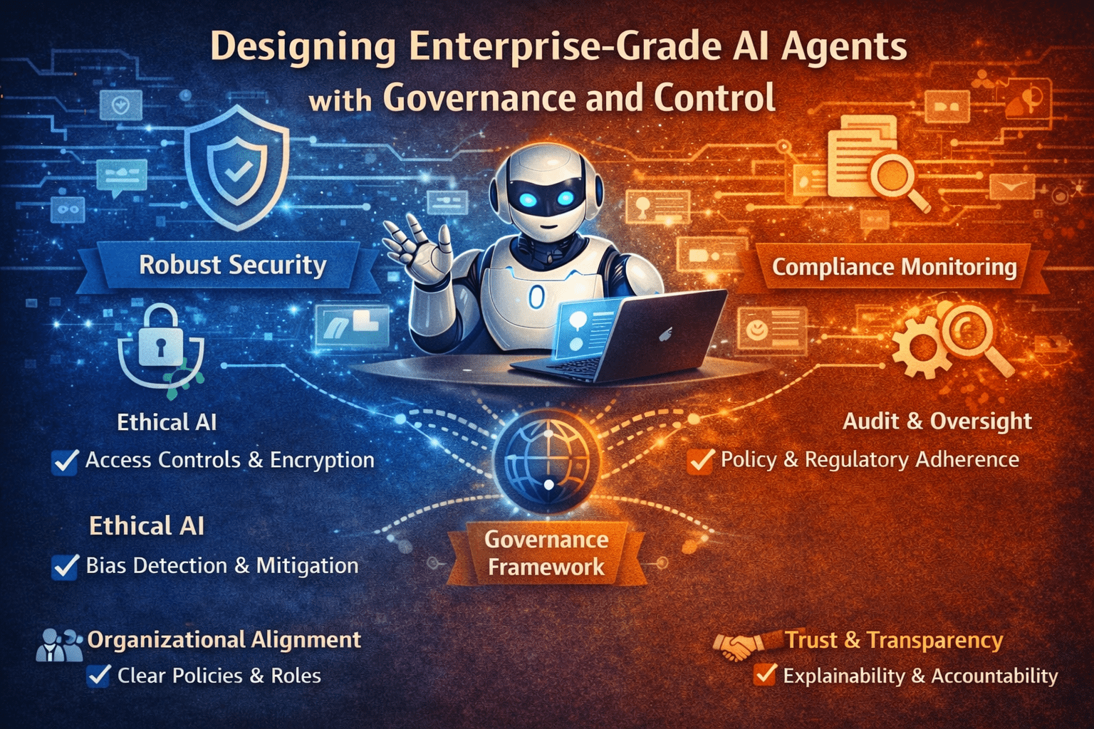 Enterprise-grade AI agent governance covers five design domains: capability governance (what the agent can do), access governance (what it can reach), action governance (what controls apply to its actions), audit governance (what evidence its operations produce), and lifecycle governance (how it is maintained, updated, and deprovisioned). Each domain requires explicit design decisions before deployment. Organizations that make those decisions deliberately build agents that are trustworthy, auditable, and maintainable. Those that skip them build technical debt that surfaces as compliance findings.