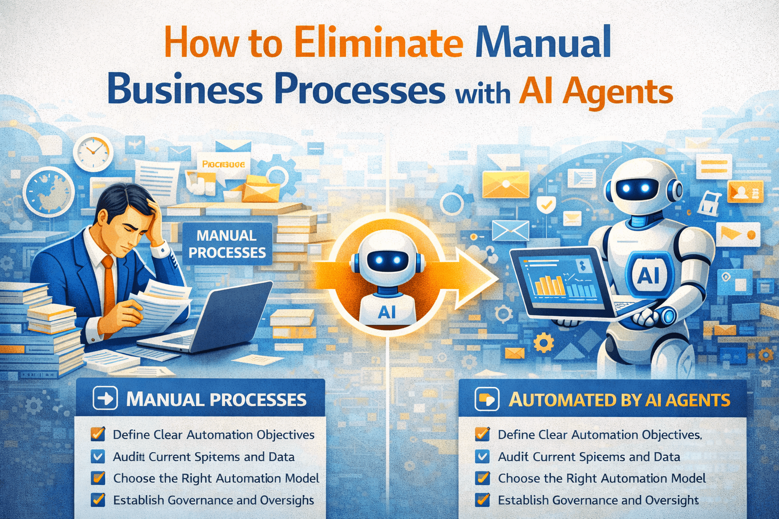 Eliminating manual business processes with AI agents requires identifying repetitive tasks, redesigning inefficient workflows before automation, deploying AI for cross-system orchestration, replacing email-based approvals, reducing spreadsheet dependency, and maintaining workforce clarity. When implemented strategically, AI agents remove administrative friction, accelerate execution cycles, and reduce operational overhead without disrupting business continuity.