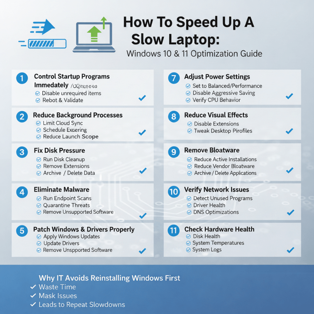A slow Windows laptop is rarely a hardware failure. In most cases, performance drops because Windows environments accumulate background load, security overhead, sync conflicts, and configuration drift over time. Windows 10 and 11 are powerful operating systems, but they require discipline to stay fast.