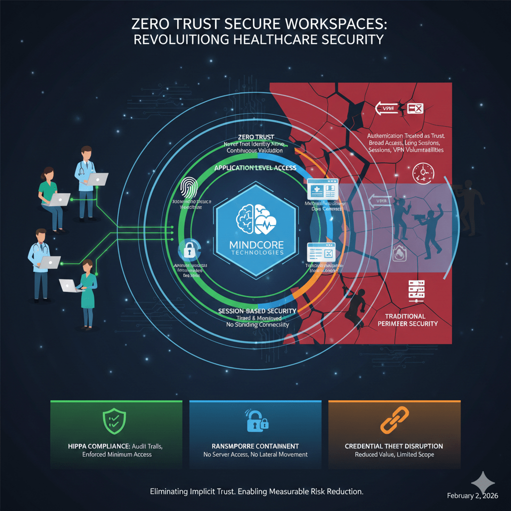 At Mindcore Technologies, healthcare breach reviews consistently show the same root cause: identity compromise instantly becomes broad system access. Zero trust secure workspaces exist to break that chain by redesigning how access, data, and sessions are controlled.