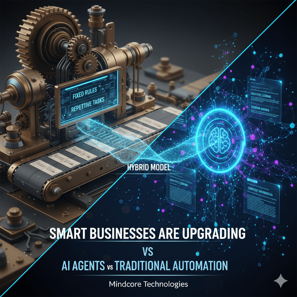 Traditional automation repeats the same workflow until someone rewrites the rules. AI agents learn from data patterns, handle exceptions without manual rule updates, and improve behavior over time — reducing maintenance overhead and extending capabilities.