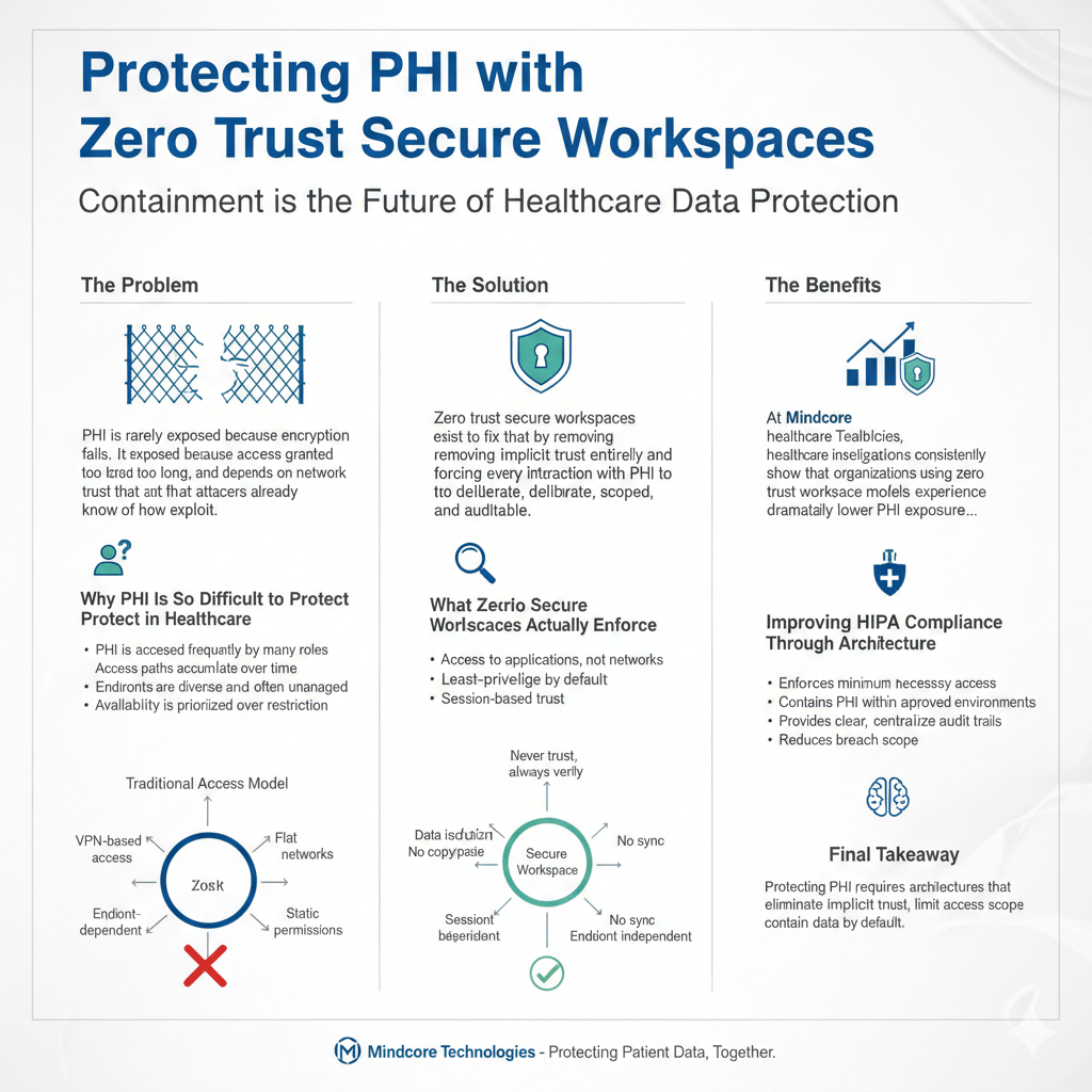 At Mindcore Technologies, healthcare breach investigations consistently show that organizations using zero trust workspace models experience dramatically lower PHI exposure, even when credentials are compromised or endpoints fail.