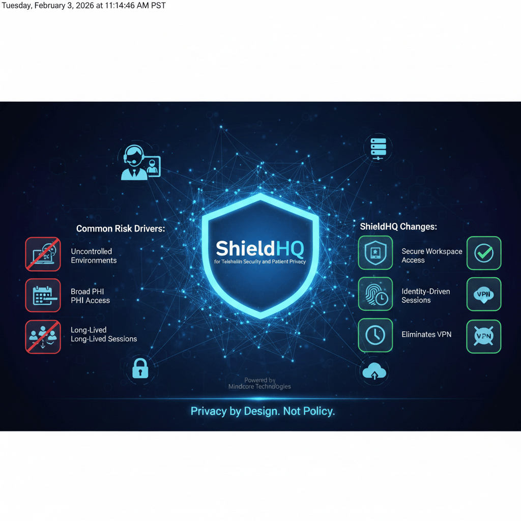 At Mindcore Technologies, telehealth risk assessments show the same pattern: access is legitimate, exposure is unnecessary, and privacy depends on endpoints that cannot be fully controlled. ShieldHQ Powered by Dispersive® Stealth Networking addresses this by redesigning how telehealth access is delivered, verified, and contained.