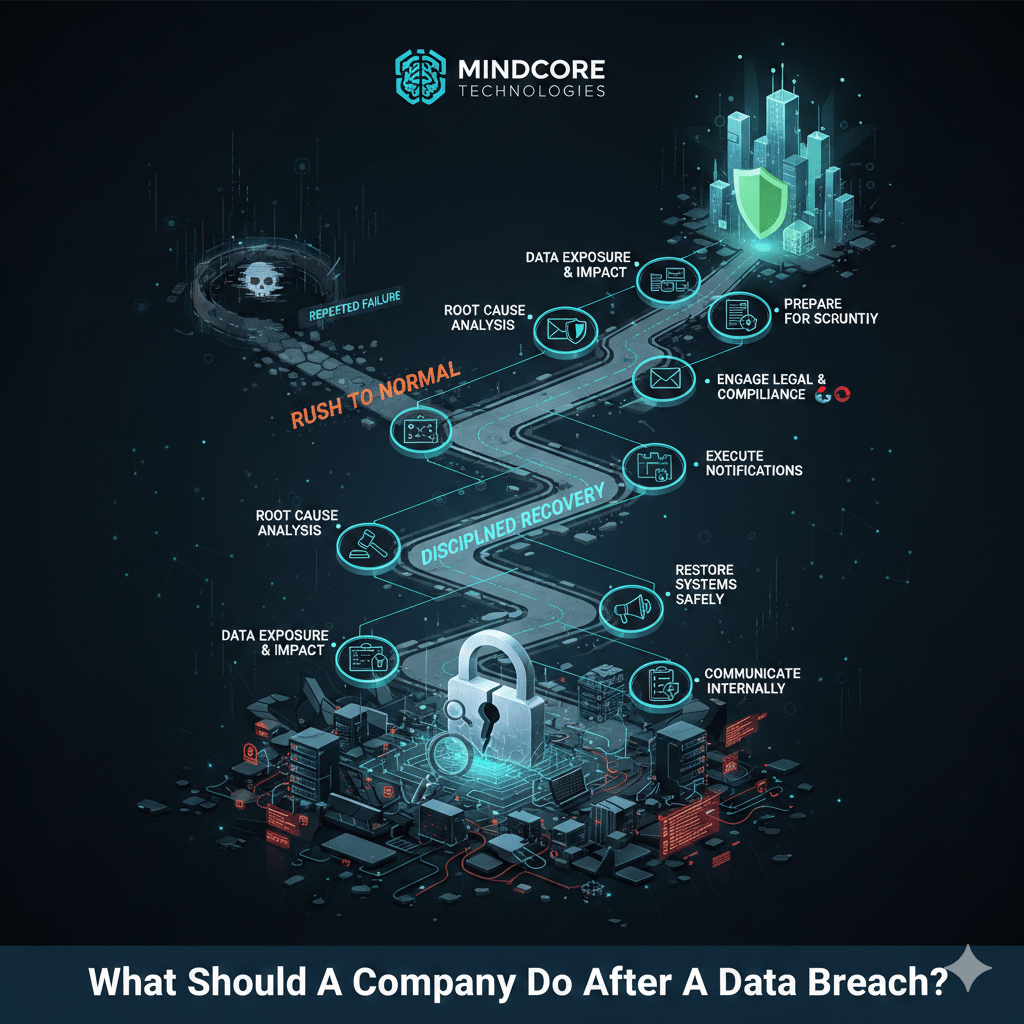 At Mindcore Technologies, post-breach reviews show a clear divide: companies that follow a disciplined, phased plan reduce long-term impact; those that rush to “get back to normal” miss root causes and reopen risk.