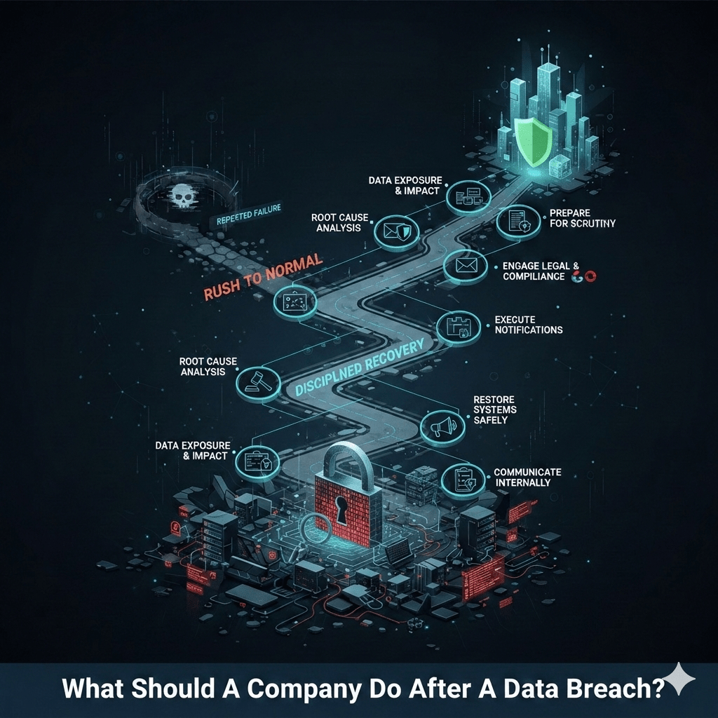 What a company does after a data breach determines whether it becomes a one-time incident or a recurring failure. Effective post-breach action is deliberate, evidence-driven, and focused on reducing trust and improving visibility.