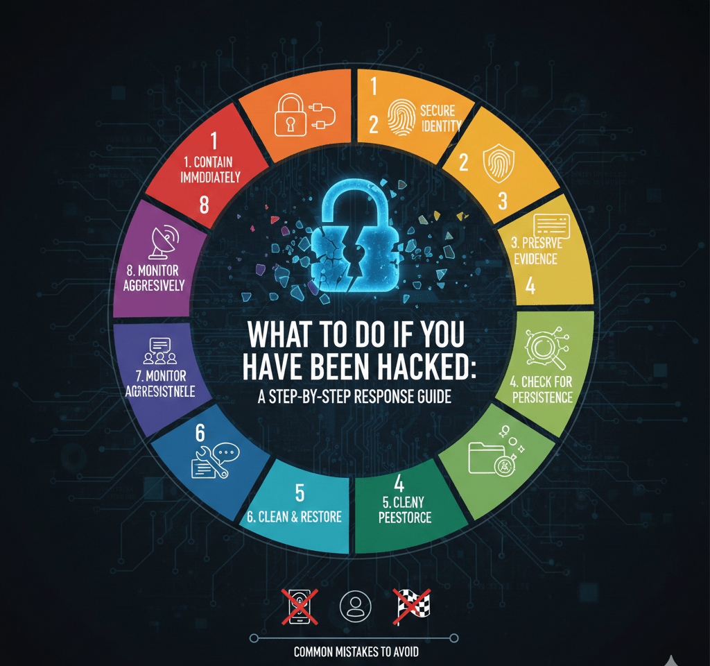 Being hacked is not defined by broken systems. It’s defined by unauthorized access. The right response stops expansion, preserves evidence, and redesigns weak trust paths. Organizations and individuals who follow a disciplined, step-by-step approach dramatically reduce damage and recovery time. Those who rush often invite the same attacker back.