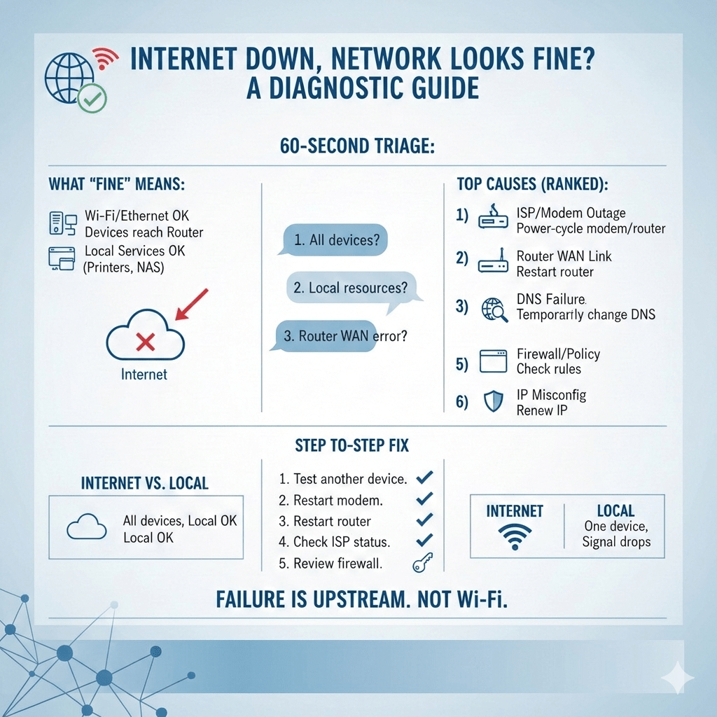 If the network looks fine but the internet is down, the failure is upstream. Check the ISP, WAN link, DNS, and security enforcement—in that order. Repeated occurrences point to missing redundancy or visibility, not bad Wi-Fi.