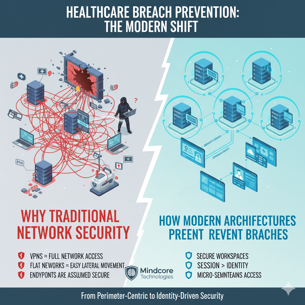 At Mindcore Technologies, healthcare incident analysis shows a clear trend: organizations relying primarily on network-based security experience wider breach impact, slower containment, and higher HIPAA exposure than those that redesign access around identity and containment.